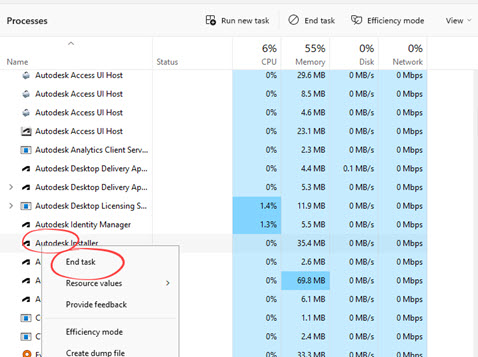 3. حالا Task Manager را باز کرده و اگر فرایندی با نام Autodesk Installer در حال اجراست، روی آن کلیک کرده و با انتخاب گزینهی End Task آن را ببندید.